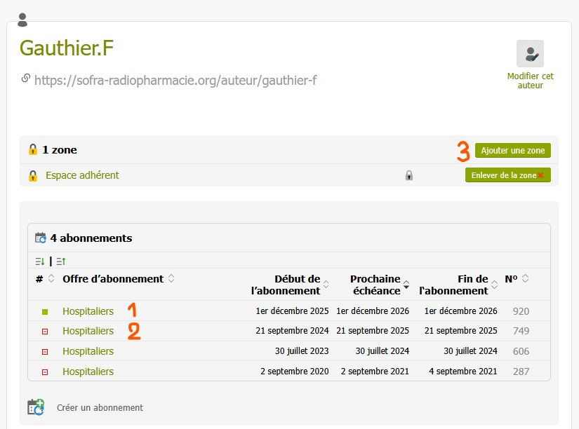 - Une pastille verte [1] indique que l’abonnement est actif ;