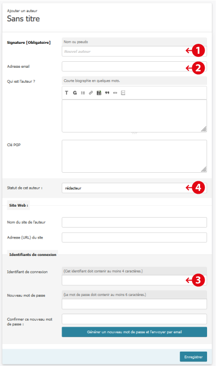 - Associer un statut à l’auteur (4). Par défaut, le statut de l’auteur est "rédacteur". Il est possible de lui attribuer un autre statut pour lui donner plus ou moins de droits :