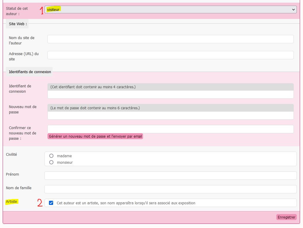 - Cocher obligatoirement la case "Artiste : Cet auteur est un artiste, son nom apparaîtra lorsqu’il sera associé aux expositions" (2) en bas du formulaire.