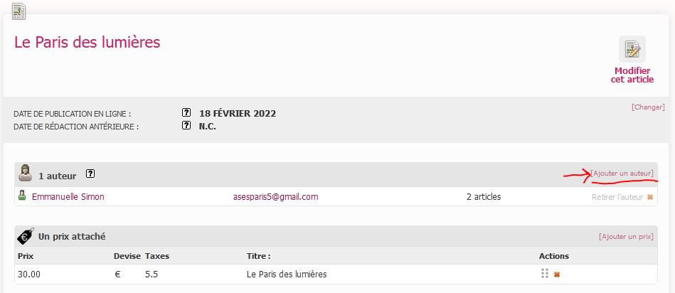 - Sur la page de l’article à associer, cliquer sur Ajouter un auteur.