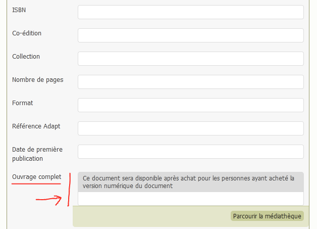 - En bas de la page, indiquez dans le champ "ouvrage complet" le document à télécharger après achat.