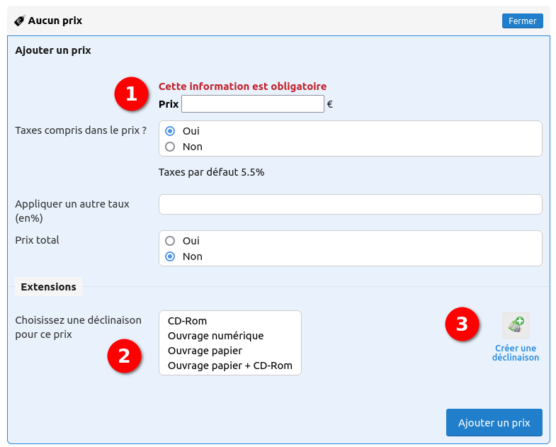 - Dans la fenêtre qui s’ouvre, indiquer un prix et éventuellement une taxe.