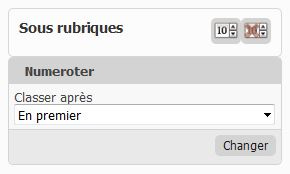 Certains éléments (par exemple les sous-rubriques sur certaines pages rubriques) sont classés par numéro de titre. Pour numéroter un élément, il suffit d’indiquer devant le titre un numéro suivi d’un point et d’un espace. Pour rendre leur tri plus facile, un encart disponible sur la colonne de droite permet de numéroter l’élément avant ou après un autre élément se situant dans la même rubrique.
