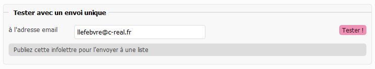 - Il est temps d’envoyer un E-mail de test pour vérifier que tout apparaît correctement dans votre client E-mail. Utiliser l’encart "tester un envoi unique" pour cela.