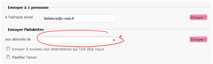 - Un nouvel encart nommé Envoyer l’infolettre apparaît. Il permet de choisir la liste de diffusion à laquelle envoyer le courrier définitif.