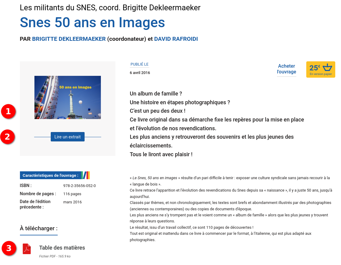 La présence d’un document ayant pour rôle Détail de l’ouvrage, Dépliant de présentation, Quatrième de couverture ou Sommaire et Introduction provoque l’apparition d’un bouton "Lire un extrait" sur la colonne de droite. - Le rôle Revue de Presse n’est pour l’instant pas utilisé pour une utilisation particulière sur le site.