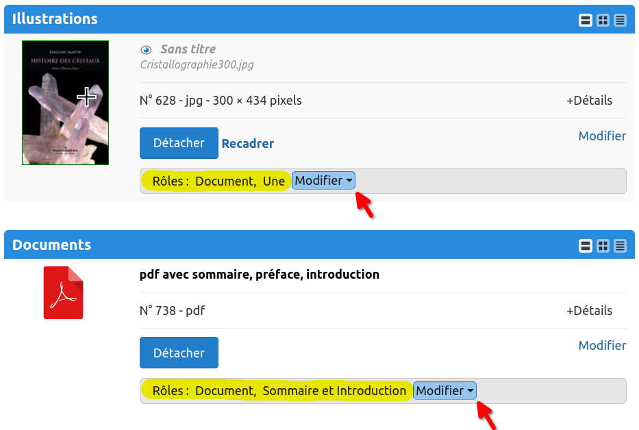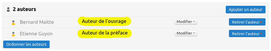Pour ajouter ou supprimer des rôles aux auteurs, il suffit de cliquer sur modifier, puis de retirer ou ajouter des rôles en fonction de la liste proposée.