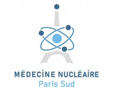 Fusion d’un atome et de la silhouette de la tour Eiffel, le logo du Service de Médecine Nucléaire - Paris Sud adopte les tons bleus et argentés pour signifier la dimension technologique de la pratique.