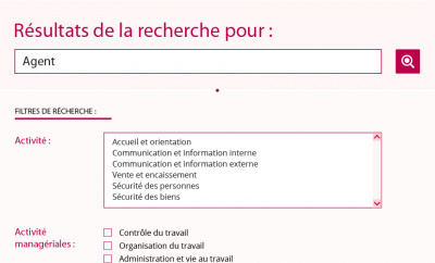 Le système permet l’import de fiches métier à partir de fichiers CSV. Un moteur de recherche permet de retrouver la fiche en fonction de multiples critères (Type d’activité, niveau de qualification, expérience, type de contrat, diplômes, etc.)