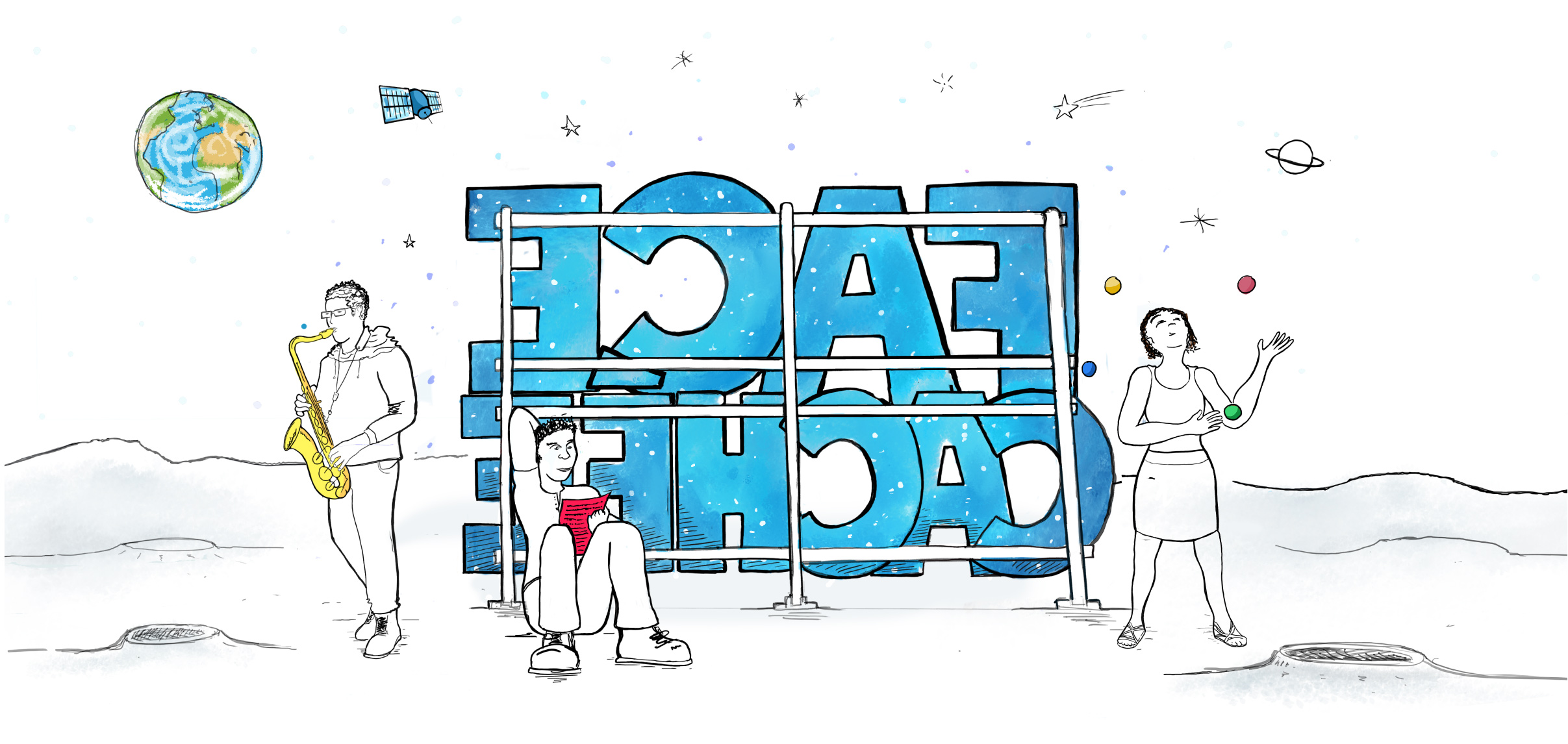 Pour agrémenter le nouveau site web de face cachée, nous avons réalisé une série d’illustrations mettant en scène plusieurs professions artistiques sur la face cachée de notre satellite.