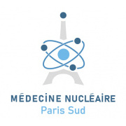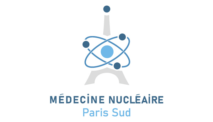 Fusion d’un atome et de la silhouette de la tour Eiffel, le logo du Service de Médecine Nucléaire - Paris Sud adopte les tons bleus et argentés pour signifier la dimension technologique de la pratique.
